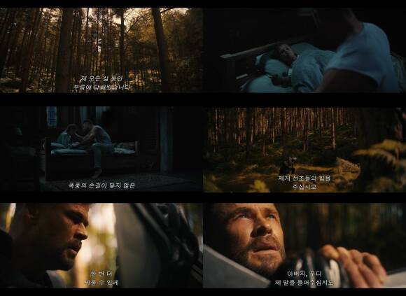 이번 예고편에서 토르는 숲속에서 아버지 오딘에게 기도하며 "딸 러브를 지킬 수 있게 한 번만 더 싸울 힘을 달라"고 간구합니다.